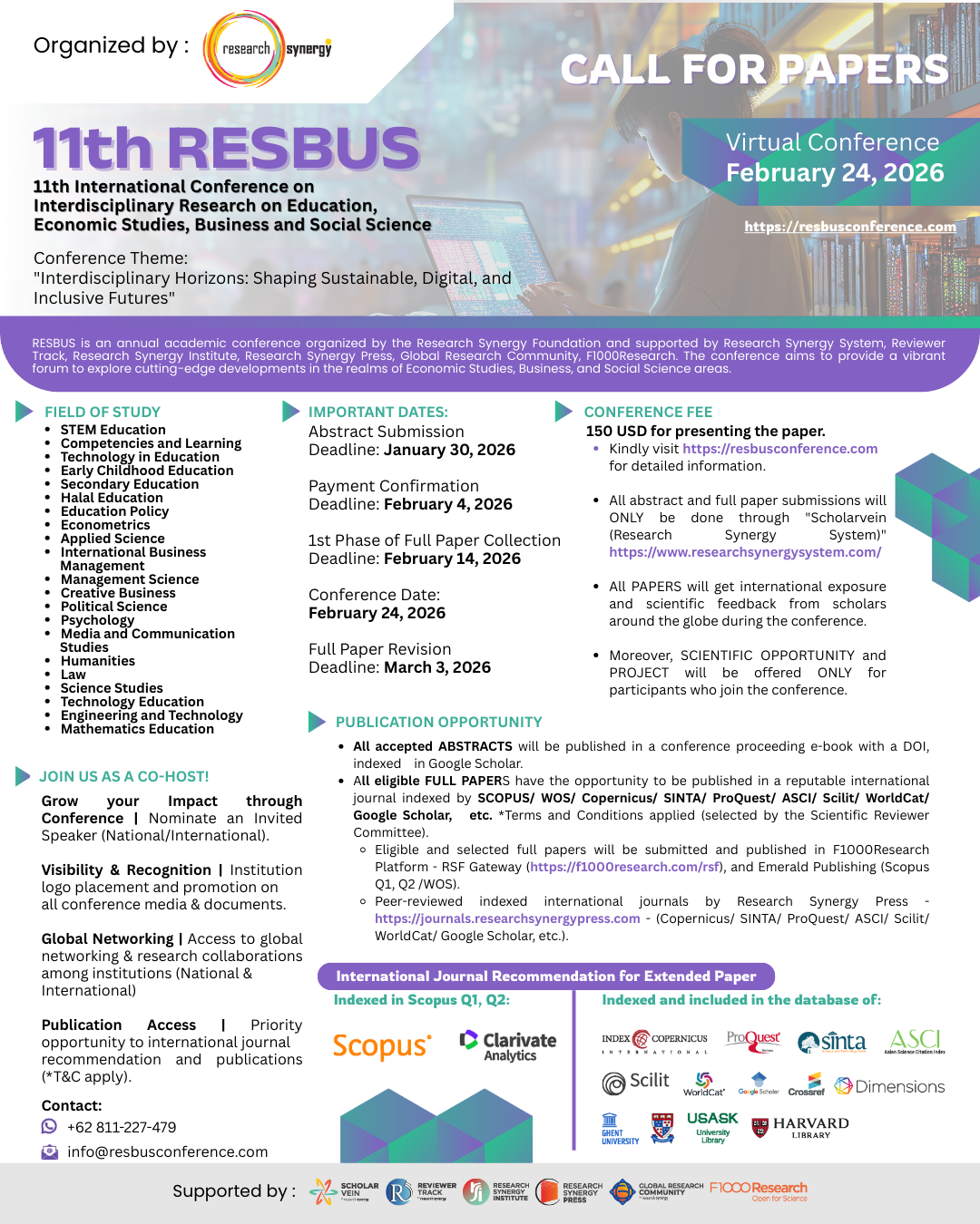 RESBUS is an annual academic conference organized by the Research Synergy Foundation and supported by Research Synergy System, Reviewer Track, Research Synergy Institute, Research Synergy Press, Global Research Ecosystem, F1000Research. The conference aims to provide a vibrant forum to explore cutting-edge developments in the realms of Economic Studies, Business, and Social Science areas.